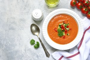 Tomato soup gazpacho or salmorejo.Top view with copy space. Posted on October 1, 2018 by Helene Labat
